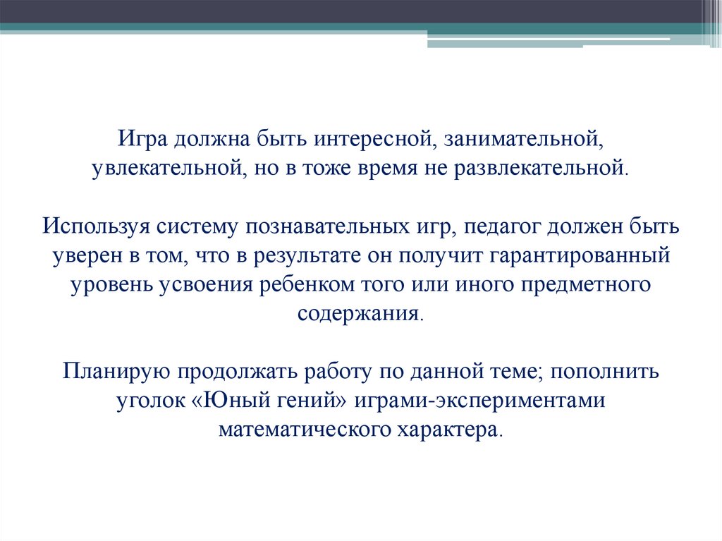 Игра должна быть интересной, занимательной,увлекательной, но в тоже время не развлекательной.