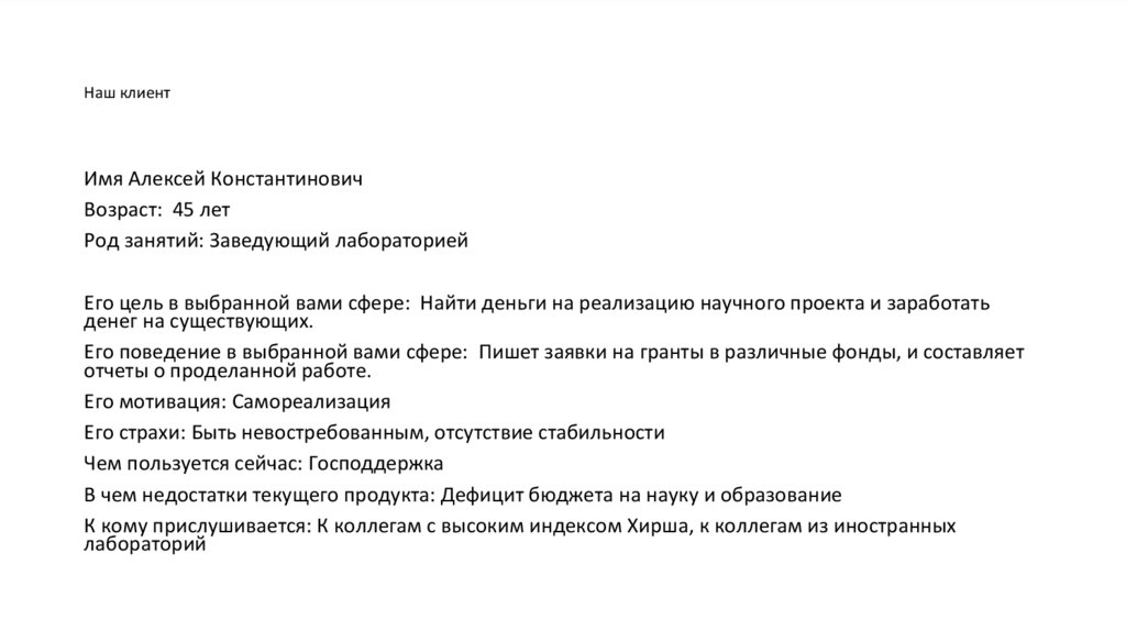 Его поведение в выбранной вами сфере: Пишет заявки на гранты в различные фонды, и составляет