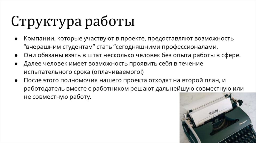 Структура работы● Компании, которые участвуют в проекте, предоставляют возможность
