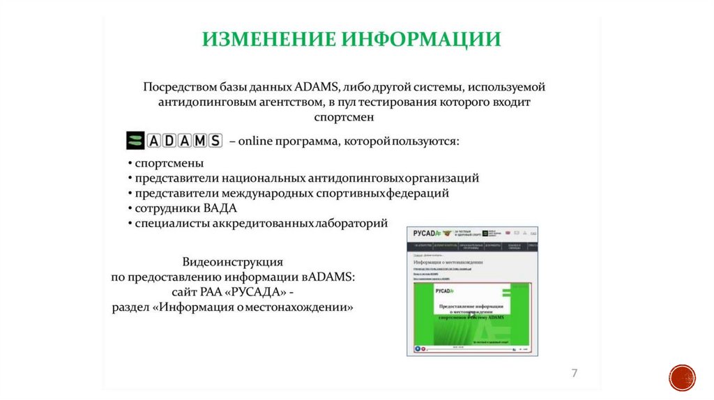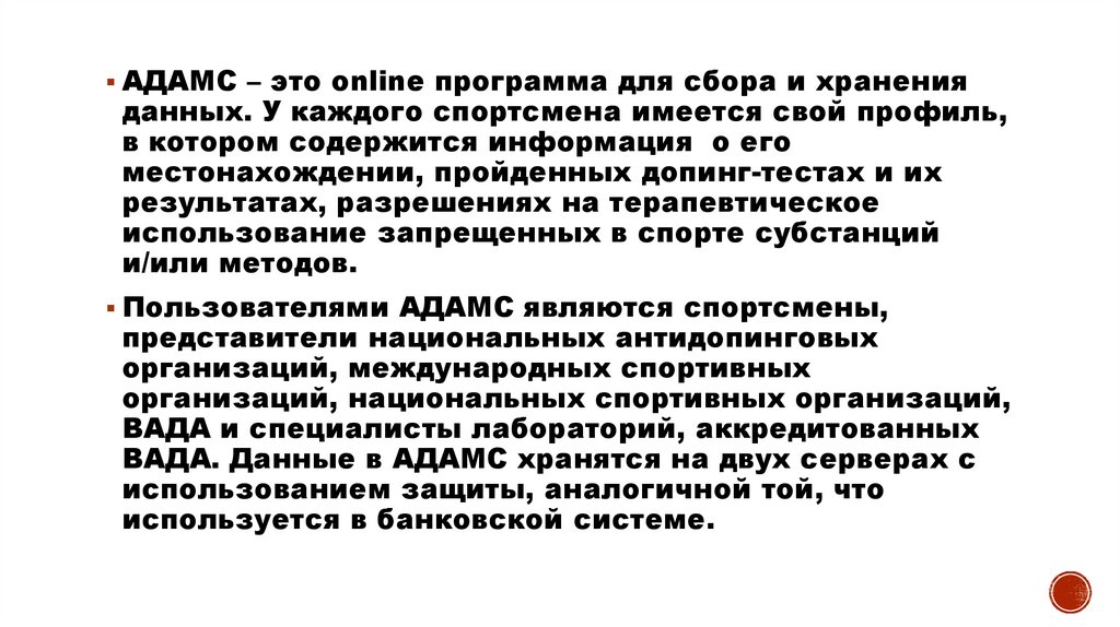 АДАМС – это online программа для сбора и храненияданных. У каждого спортсмена имеется свой профиль,