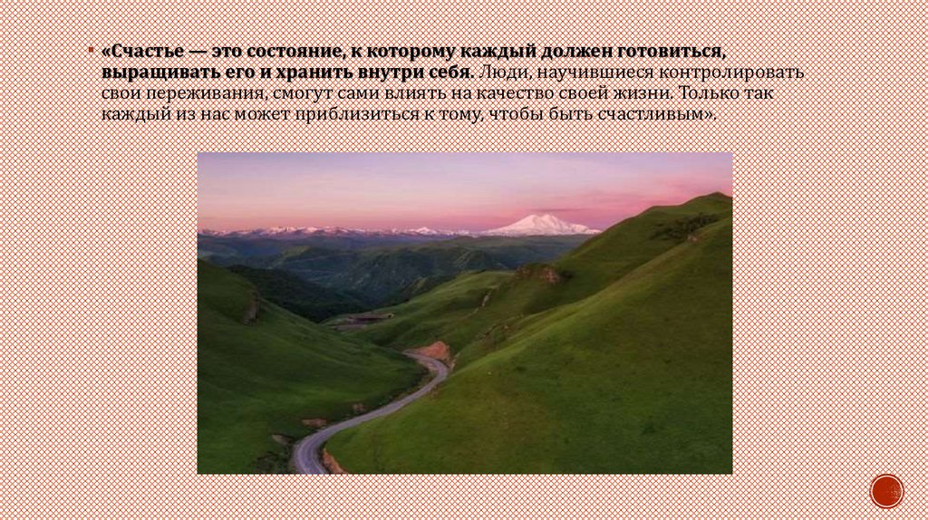 «Счастье — это состояние, к которому каждый должен готовиться,выращивать его и хранить внутри себя. Люди, научившиеся контролировать