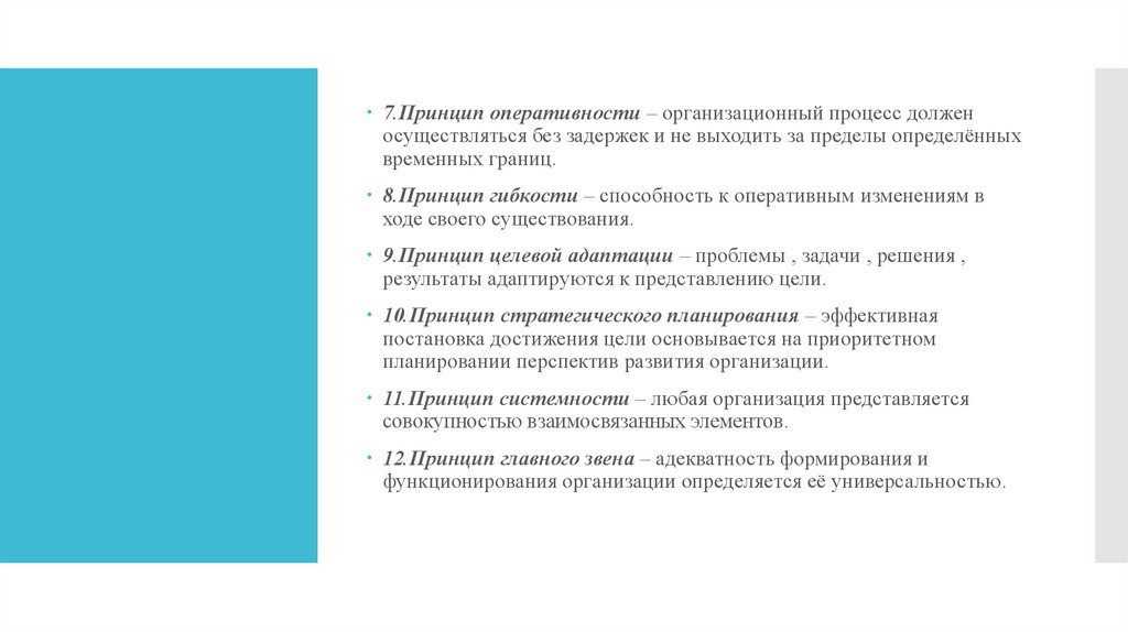 7.Принцип оперативности – организационный процесс долженосуществляться без задержек и не выходить за пределы определённых