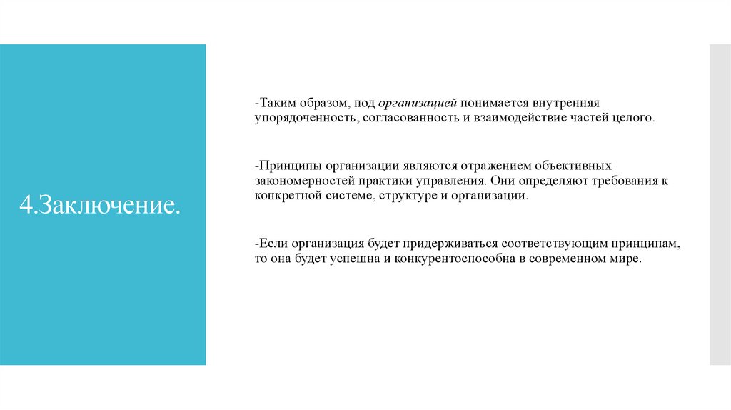 -Таким образом, под организацией понимается внутренняяупорядоченность, согласованность и взаимодействие частей целого.
