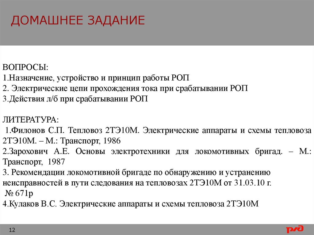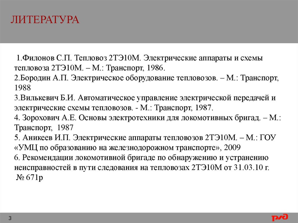 ЛИТЕРАТУРА1.Филонов С.П. Тепловоз 2ТЭ10М. Электрические аппараты и схемы