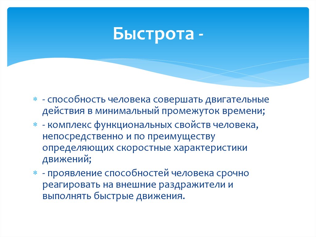 Быстрота - способность человека совершать двигательныедействия в минимальный промежуток времени;