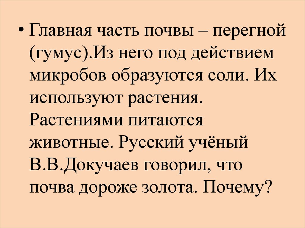 • Главная часть почвы – перегной(гумус).Из него под действием