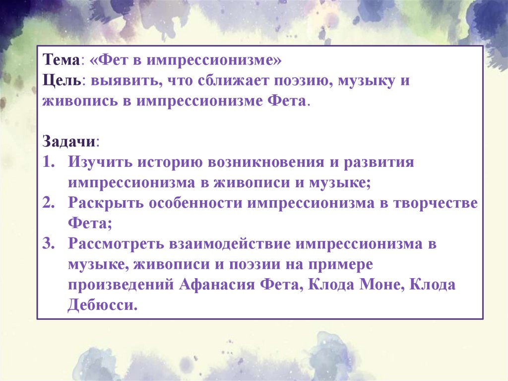 Тема: «Фет в импрессионизме»Цель: выявить, что сближает поэзию, музыку и