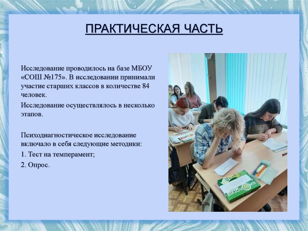 ПРАКТИЧЕСКАЯ ЧАСТЬИсследование проводилось на базе МБОУ