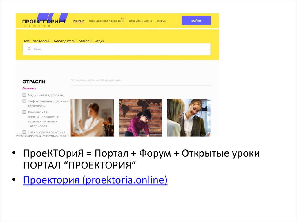 • ПроеКТОриЯ = Портал + Форум + Открытые урокиПОРТАЛ “ПРОЕКТОРИЯ”