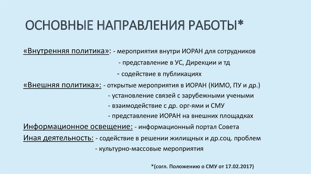 ОСНОВНЫЕ НАПРАВЛЕНИЯ РАБОТЫ*«Внутренняя политика»: - мероприятия внутри ИОРАН для сотрудников