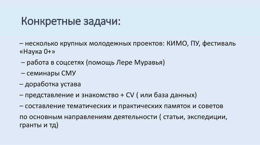 Конкретные задачи:– несколько крупных молодежных проектов: КИМО, ПУ, фестиваль
