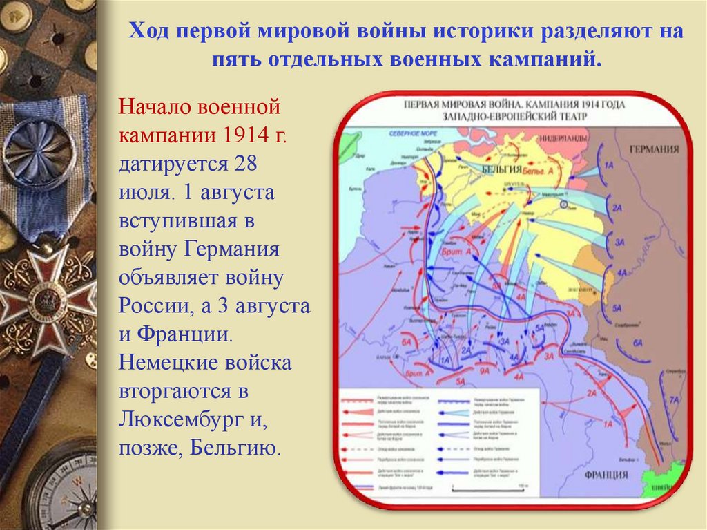 Ход первой мировой войны историки разделяют напять отдельных военных кампаний.