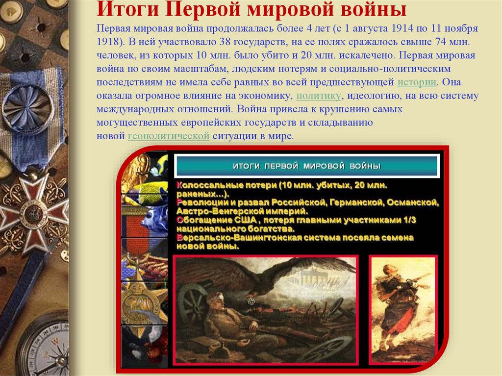 Итоги Первой мировой войныПервая мировая война продолжалась более 4 лет (с 1 августа 1914 по 11 ноября