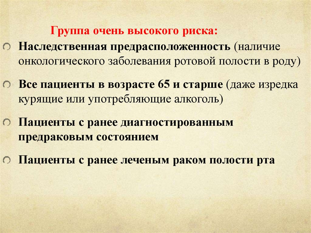 Группа очень высокого риска:Наследственная предрасположенность (наличие