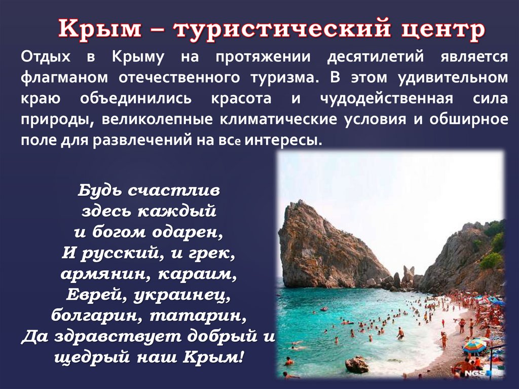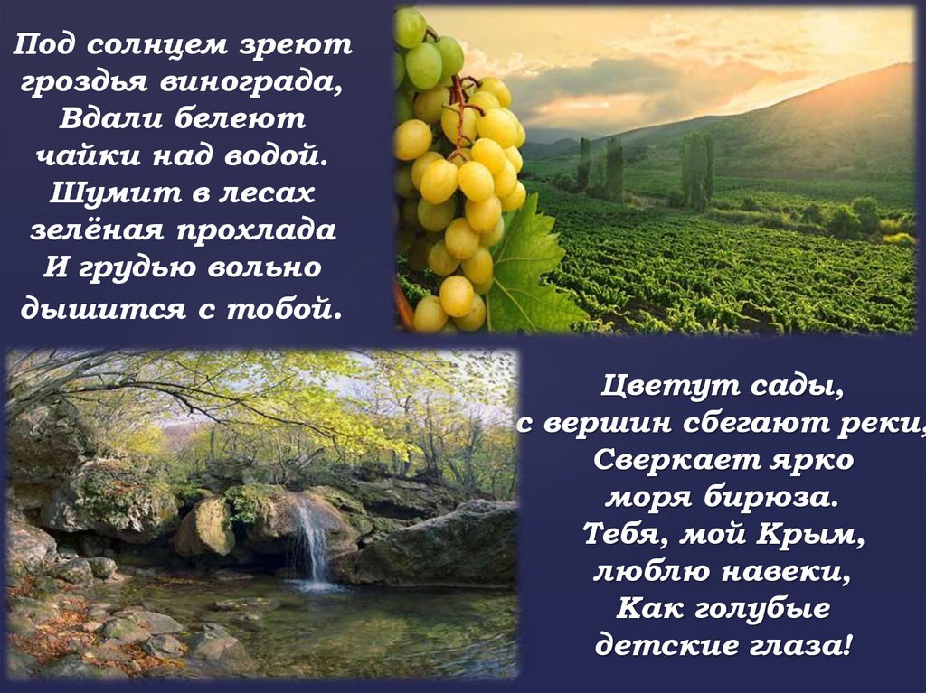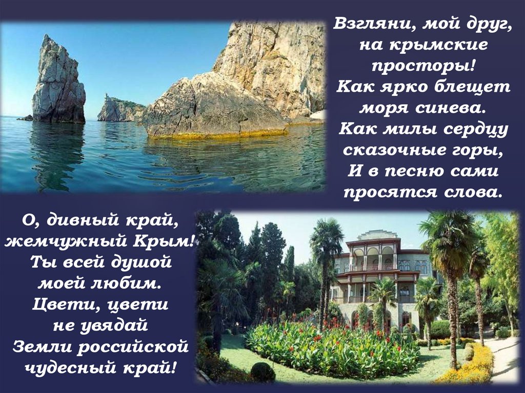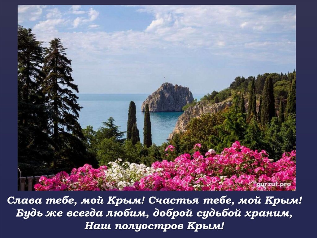 Слава тебе, мой Крым! Счастья тебе, мой Крым!Будь же всегда любим, доброй судьбой храним,