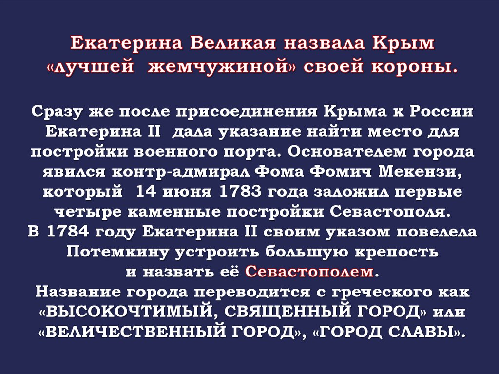 Сразу же после присоединения Крыма к РоссииЕкатерина II дала указание найти место для