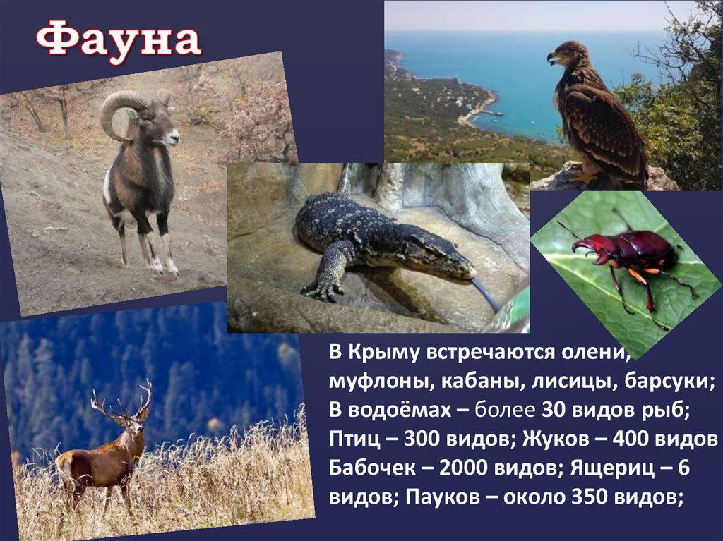 В Крыму встречаются олени,муфлоны, кабаны, лисицы, барсуки;