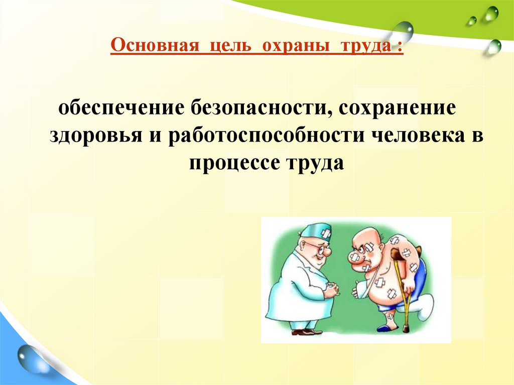 Основная цель охраны труда :обеспечение безопасности, сохранение