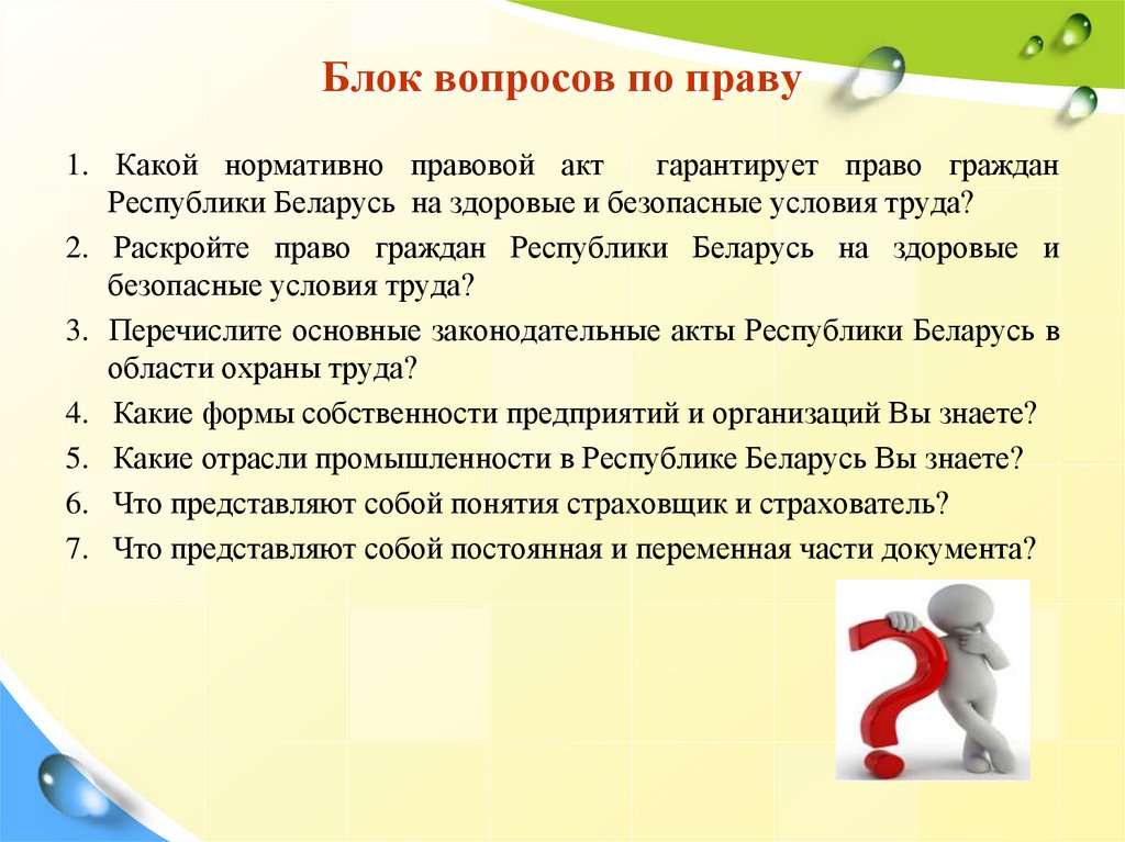 Блок вопросов по праву1. Какой нормативно правовой акт