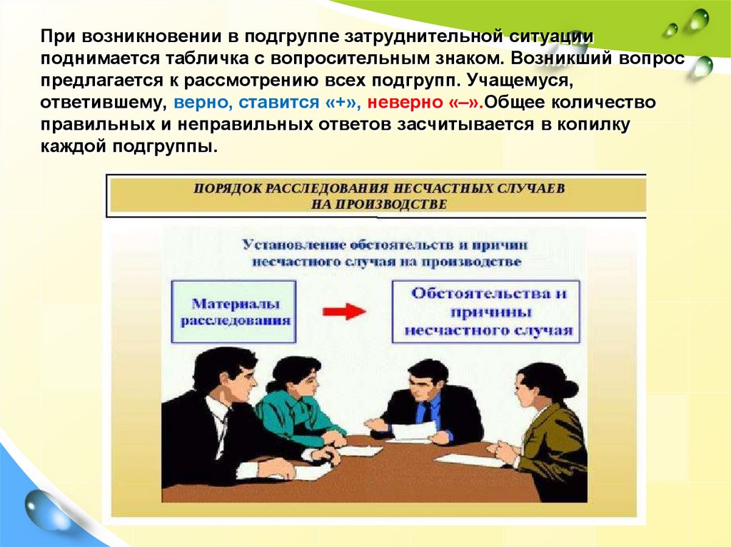 При возникновении в подгруппе затруднительной ситуацииподнимается табличка с вопросительным знаком. Возникший вопрос