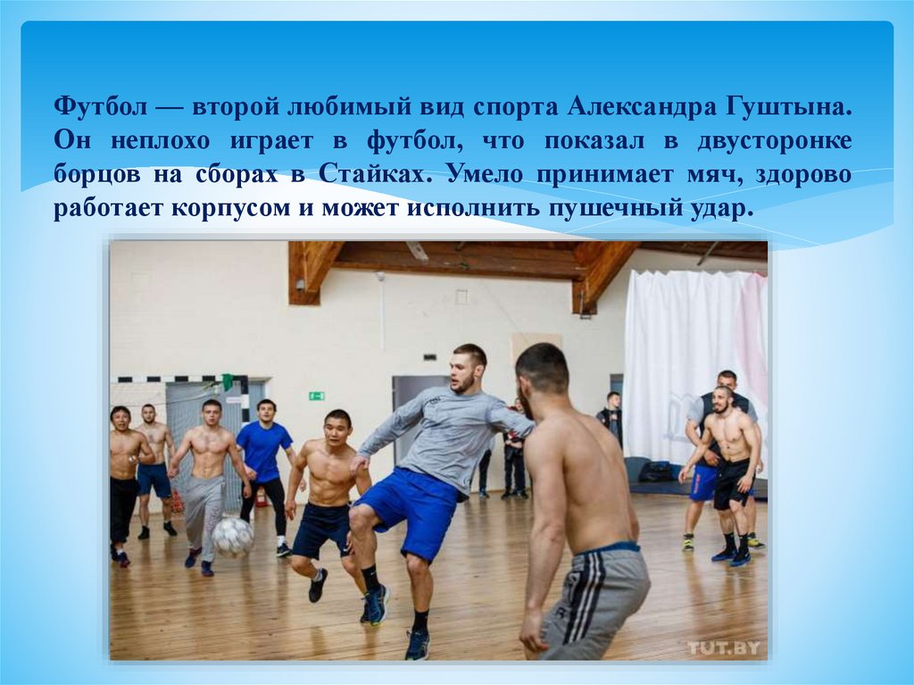 Футбол — второй любимый вид спорта Александра Гуштына.Он неплохо играет в футбол, что показал в двусторонке