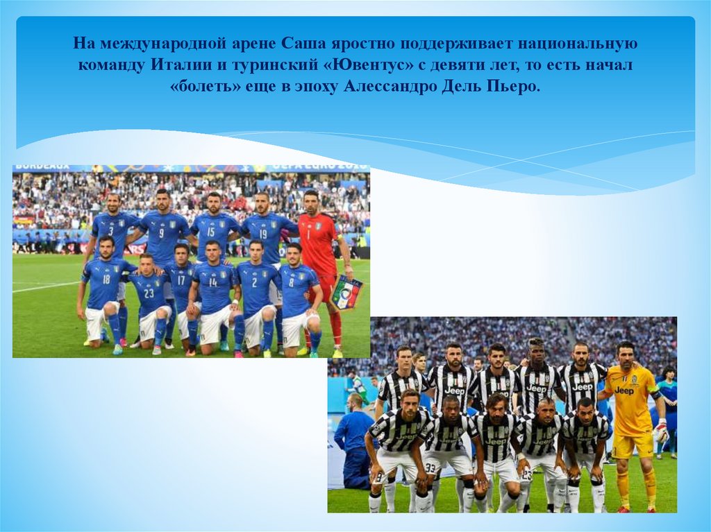 На международной арене Саша яростно поддерживает национальнуюкоманду Италии и туринский «Ювентус» с девяти лет, то есть начал