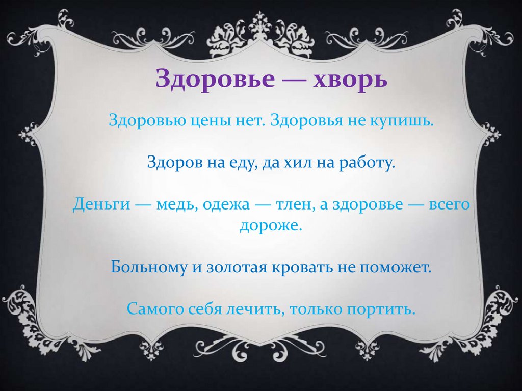 Здоровье — хворьЗдоровью цены нет. Здоровья не купишь.
