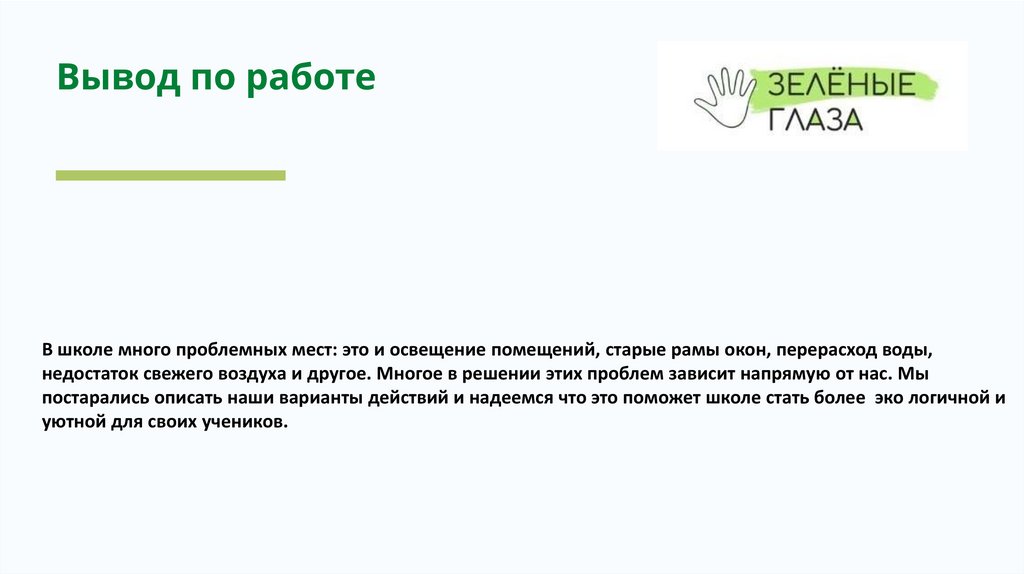 Вывод по работеВ школе много проблемных мест: это и освещение помещений, старые рамы окон, перерасход воды,