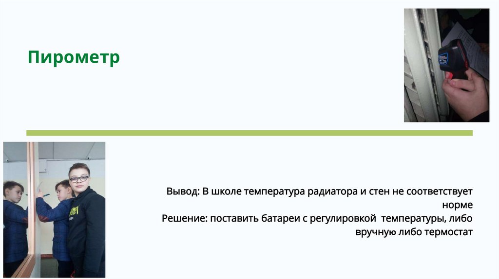 ПирометрВывод: В школе температура радиатора и стен не соответствует