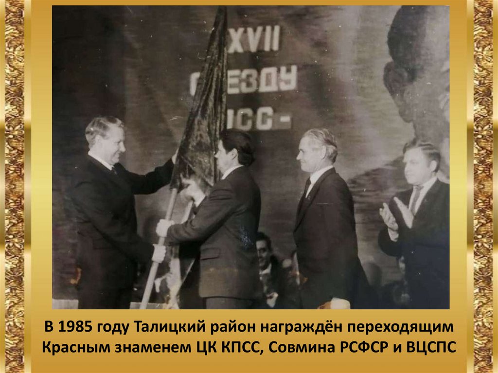 В 1985 году Талицкий район награждён переходящимКрасным знаменем ЦК КПСС, Совмина РСФСР и ВЦСПС