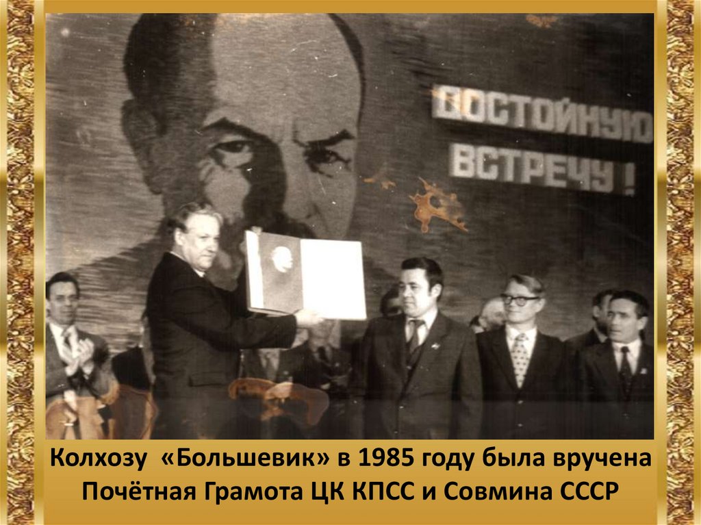 Колхозу «Большевик» в 1985 году была врученаПочётная Грамота ЦК КПСС и Совмина СССР