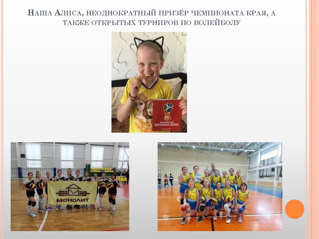 НАША АЛИСА, НЕОДНОКРАТНЫЙ ПРИЗЁР ЧЕМПИОНАТА КРАЯ, AТАКЖЕ ОТКРЫТЫХ ТУРНИРОВ ПО ВОЛЕЙБОЛУ