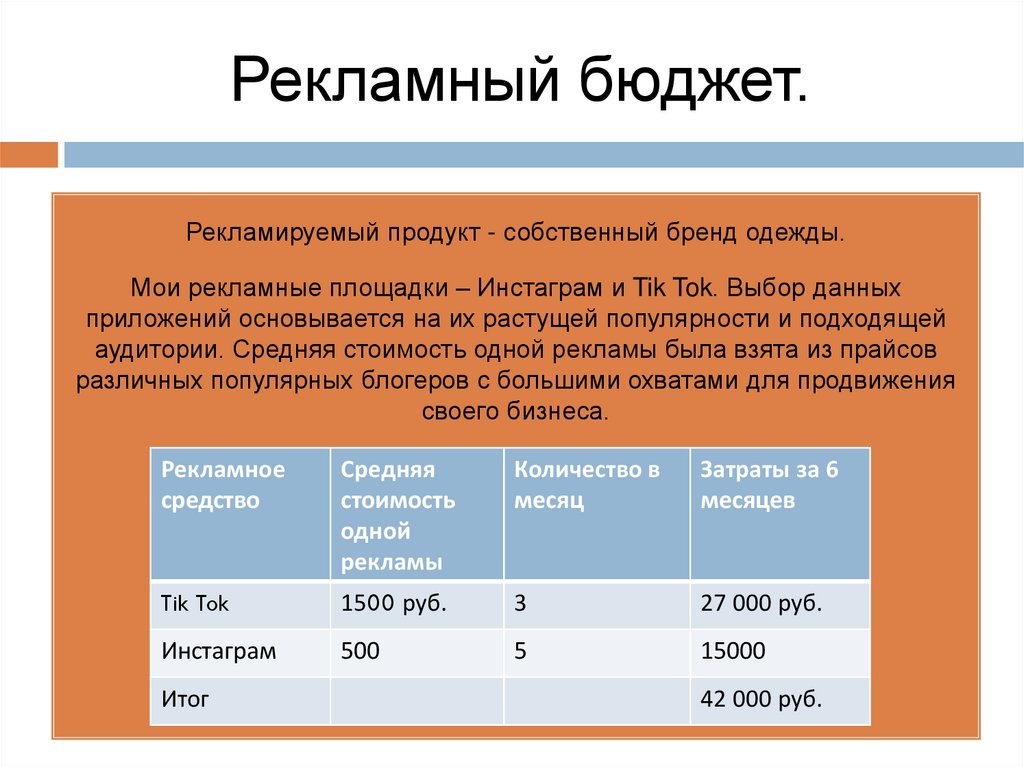 Рекламный бюджет.Рекламируемый продукт - собственный бренд одежды.