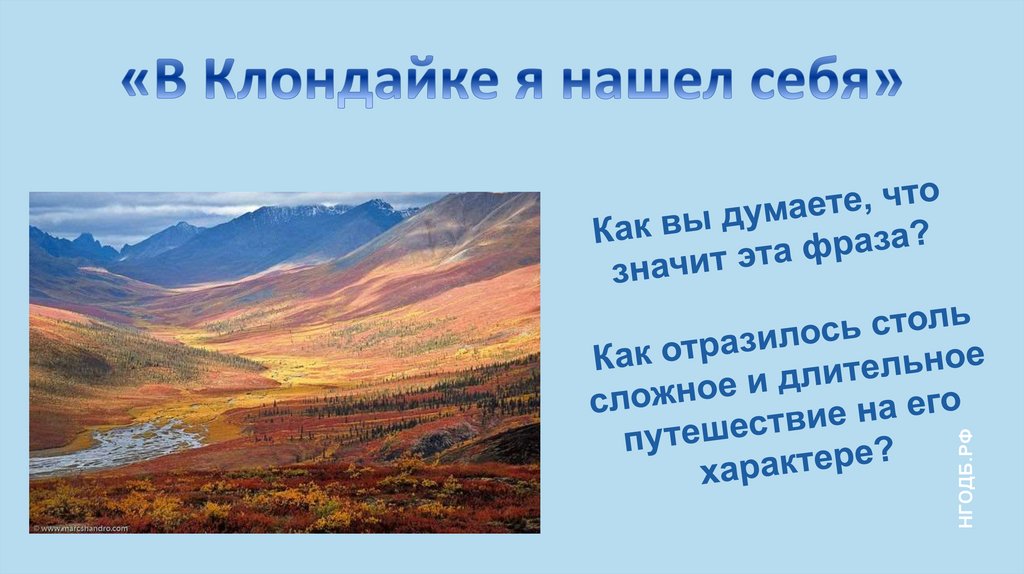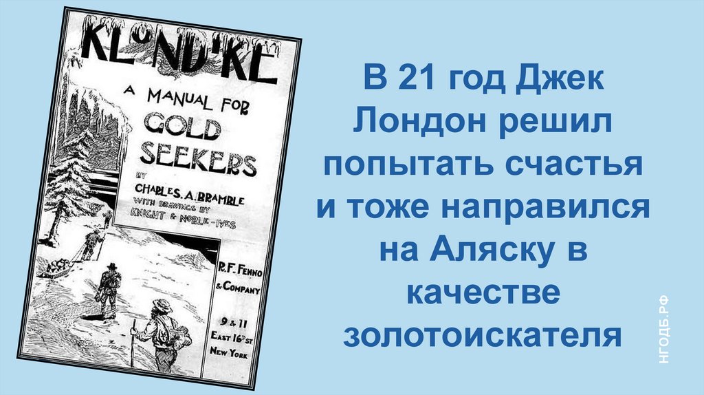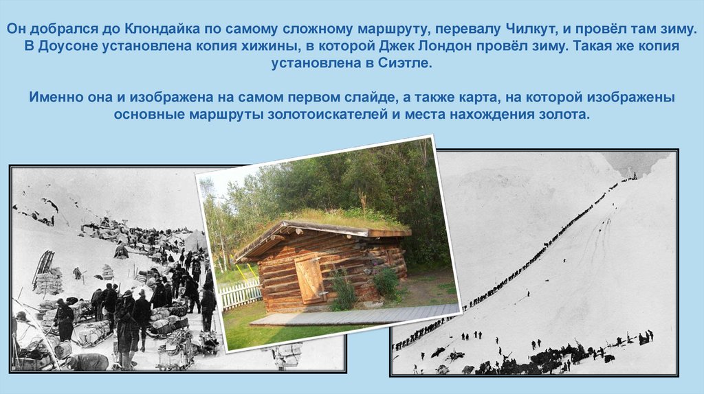 Он добрался до Клондайка по самому сложному маршруту, перевалу Чилкут, и провёл там зиму.В Доусоне установлена копия хижины, в которой Джек Лондон провёл зиму. Такая же копия