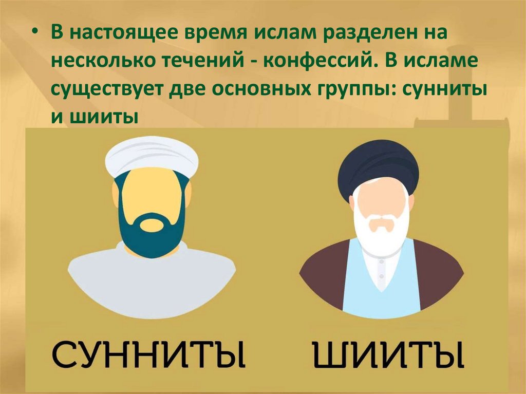 • В настоящее время ислам разделен нанесколько течений - конфессий. В исламе