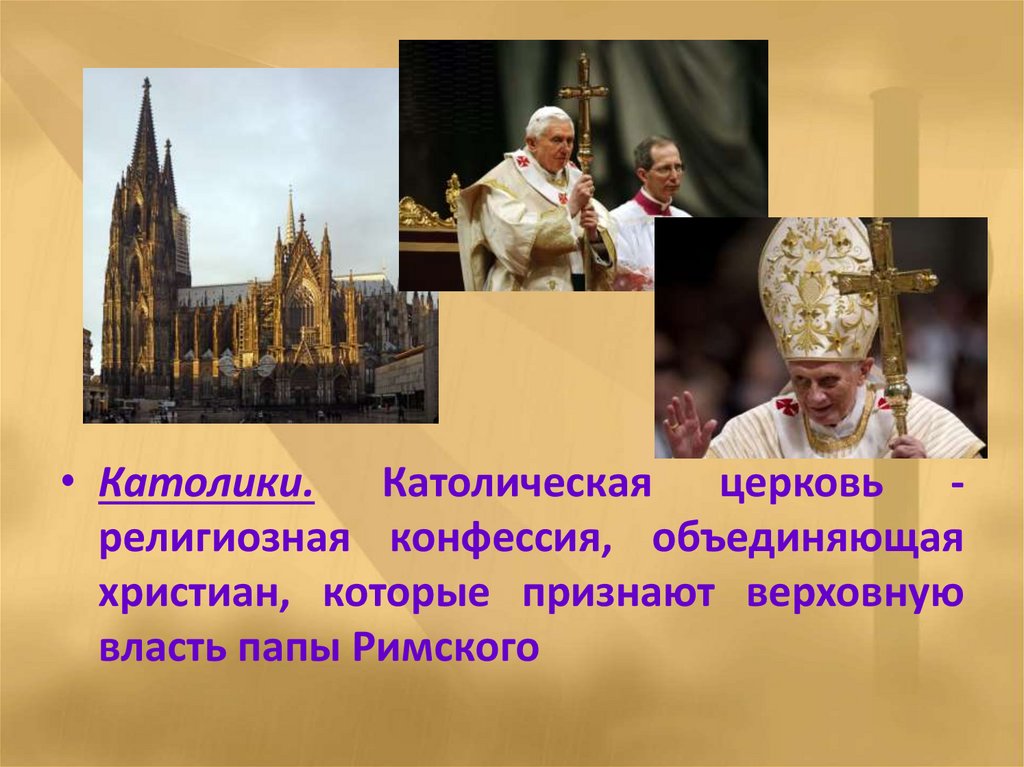 • Католики. Католическая церковь религиозная конфессия, объединяющаяхристиан, которые признают верховную