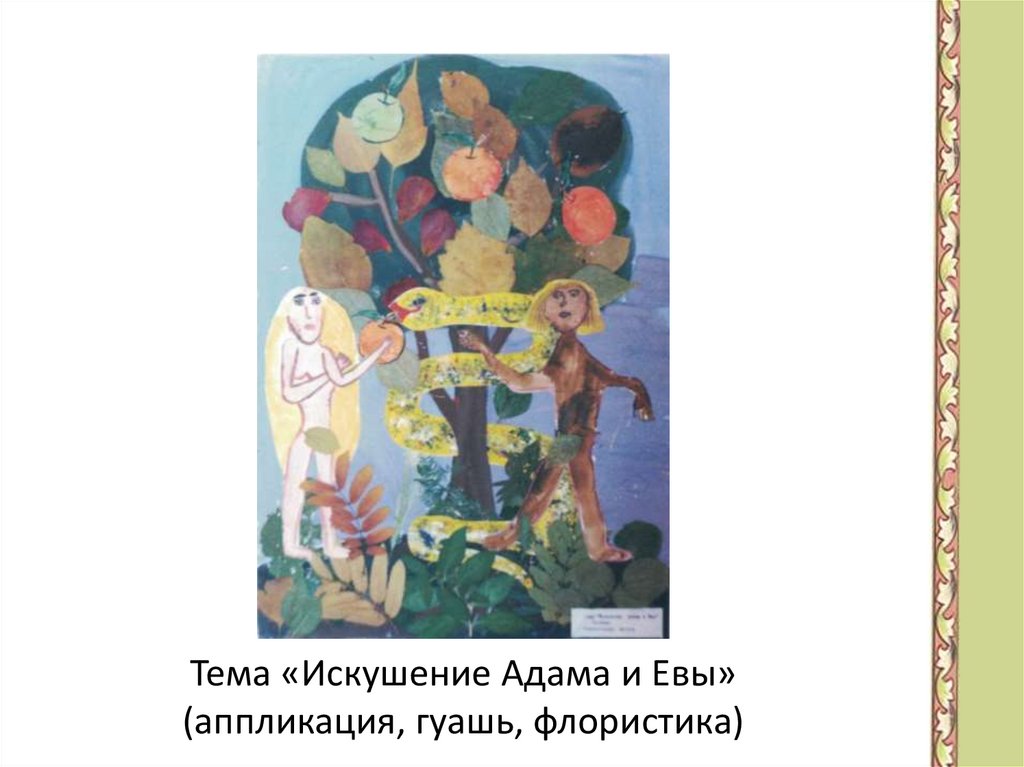 Тема «Искушение Адама и Евы»(аппликация, гуашь, флористика)