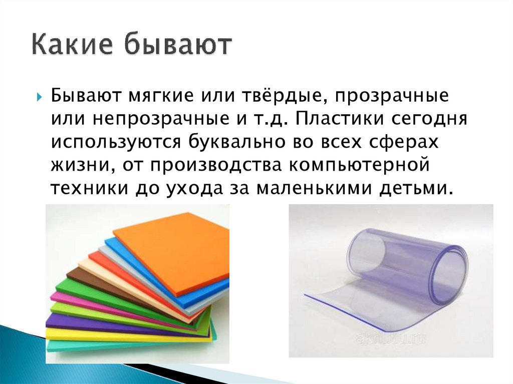 Бывают мягкие или твёрдые, прозрачныеили непрозрачные и т.д. Пластики сегодня
