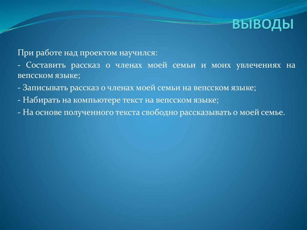 При работе над проектом научился:- Составить рассказ о членах моей семьи и моих увлечениях на