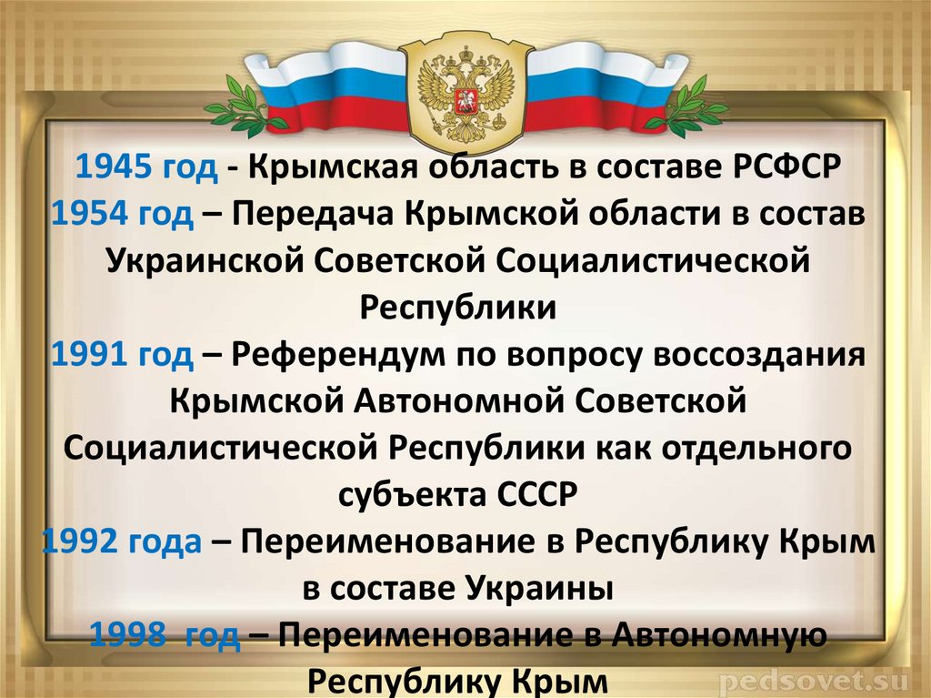 1945 год - Крымская область в составе РСФСР1954 год – Передача Крымской области в состав