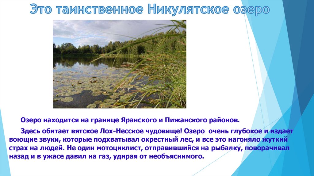 Озеро находится на границе Яранского и Пижанского районов.Здесь обитает вятское Лох-Несское чудовище! Озеро очень глубокое и издает