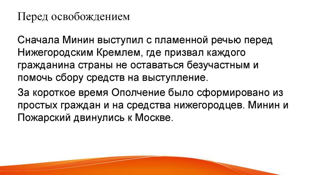 Перед освобождениемСначала Минин выступил с пламенной речью перед