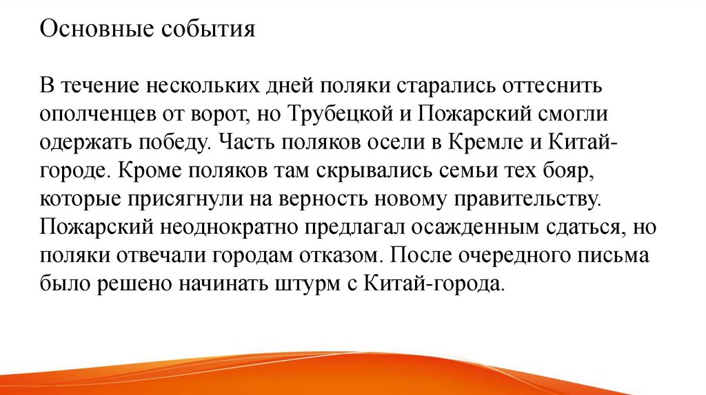 одержать победу. Часть поляков осели в Кремле и Китайгороде. Кроме поляков там скрывались семьи тех бояр,