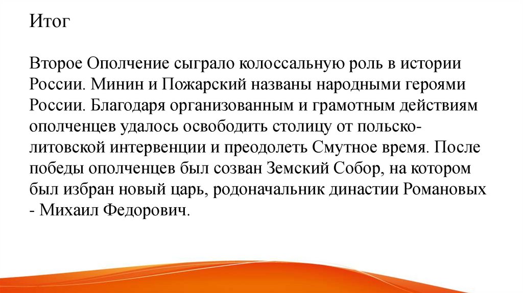 ИтогВторое Ополчение сыграло колоссальную роль в истории