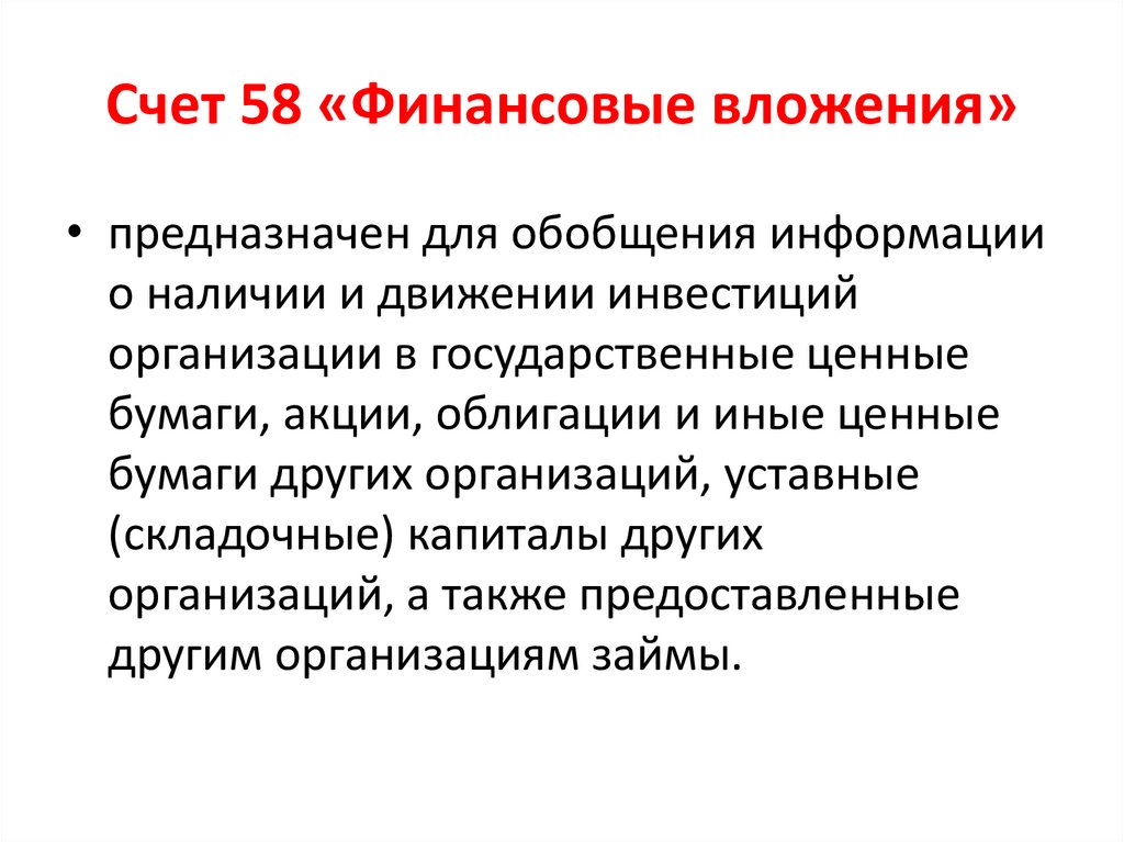 Счет 58 «Финансовые вложения»• предназначен для обобщения информации