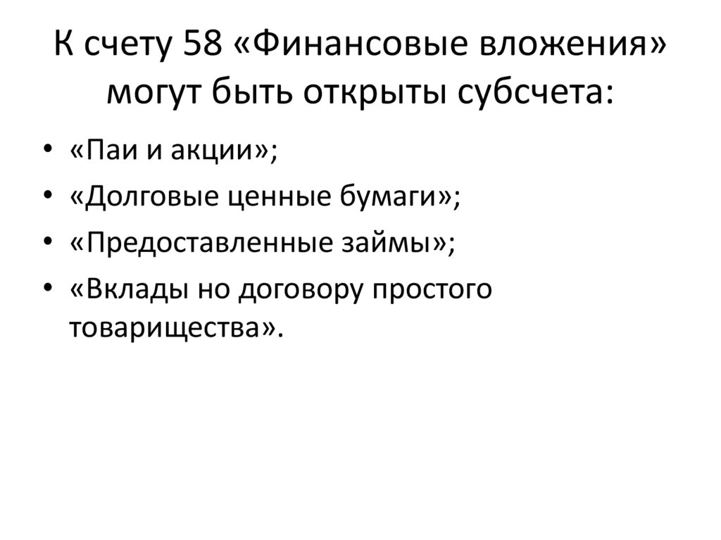К счету 58 «Финансовые вложения»могут быть открыты субсчета: