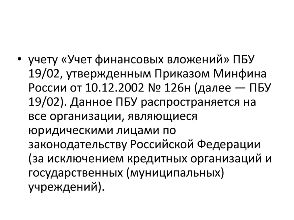 • учету «Учет финансовых вложений» ПБУ19/02, утвержденным Приказом Минфина