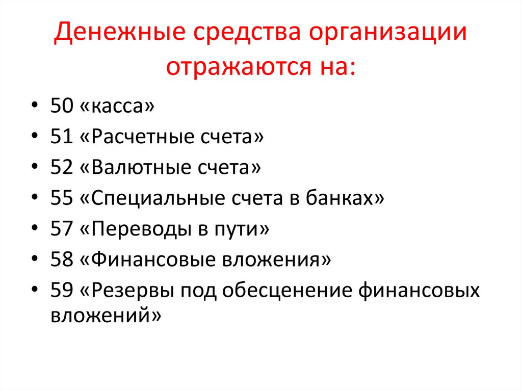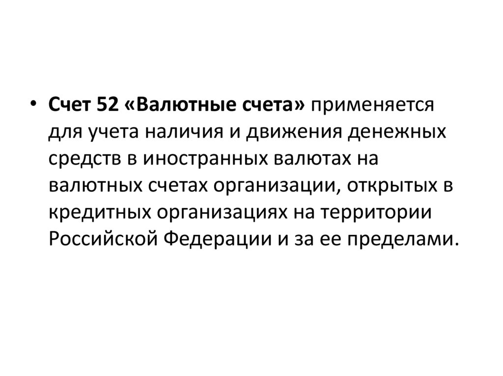 • Счет 52 «Валютные счета» применяетсядля учета наличия и движения денежных