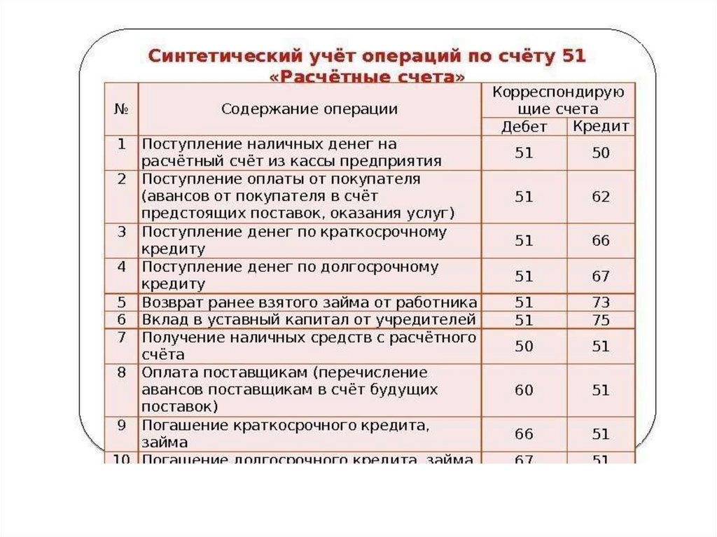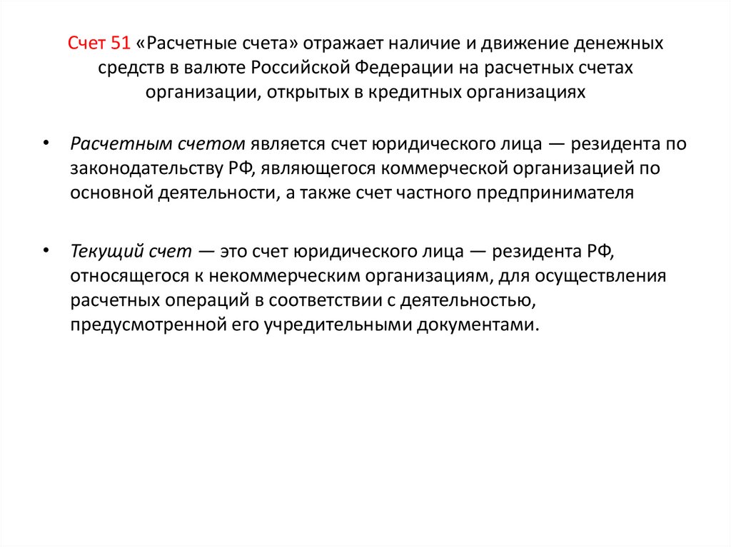 Счет 51 «Расчетные счета» отражает наличие и движение денежныхсредств в валюте Российской Федерации на расчетных счетах