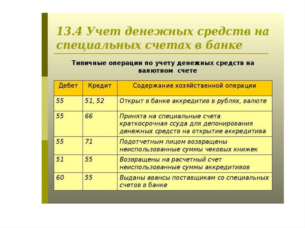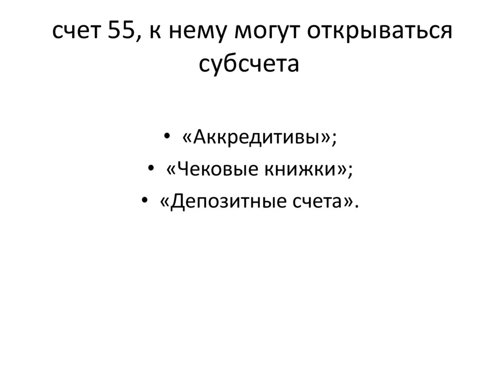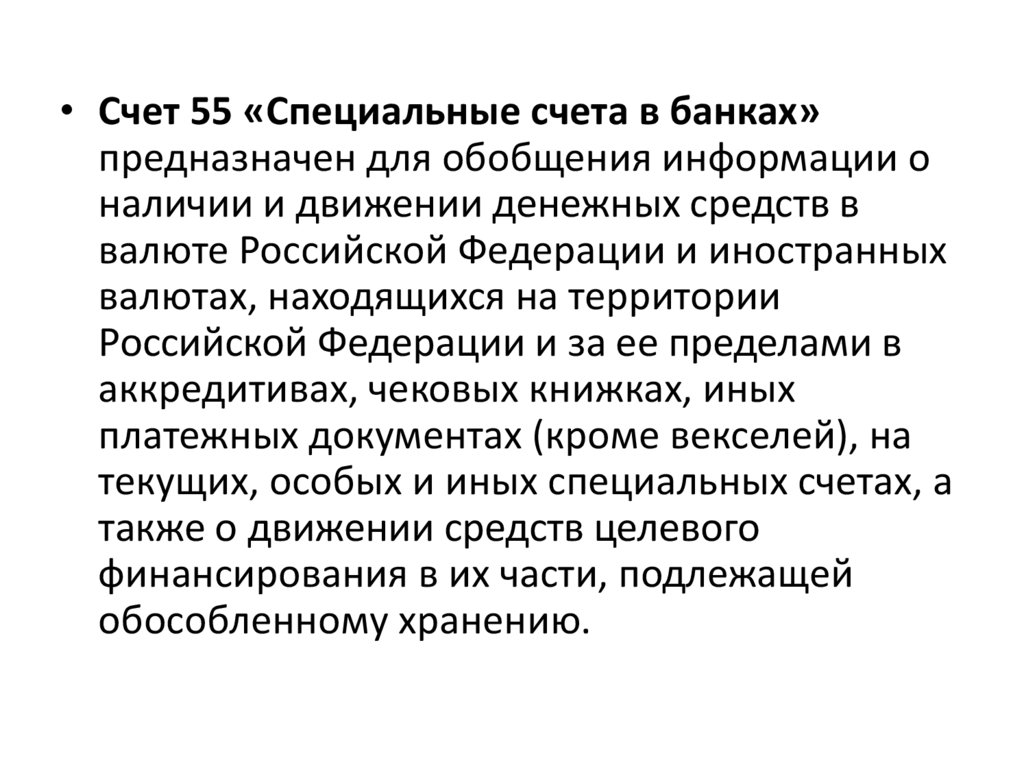 • Счет 55 «Специальные счета в банках»предназначен для обобщения информации о